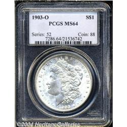 <table><tr><td><table><tr><td>1903-O S$1 MS64 PCGS. Bright and untoned with a few small abrasions and a better than average strike. Once a rare date in the series.From the Virgil Farstad Collection. <BR><BR><B>Important notice:</B> Heritage usually auctions material at the rate of 200-250 lots per hour. On some occasions eBay Live bid software or the Internet may not be able to keep up with the pace of the auction. We recommend placing a realistic absentee bid now as insurance to avoid disappointment. Occasionally the auctioneer may eliminate or reject an eBay Live bid, and the auctioneer may also reopen a lot after the close of the eBay live bidding (usually because we missed an audience bid), and may reject your bid even if it shows you as the winning bidder. By bidding via eBay Live, you agree that Heritage may award the lot to another bidder at its sole discretion under the circumstances described above or any other reasonable circumstances. Since eBay bids are not shown to us until we open the lot on the floor, we treat those bids just like floor bids. In most cases the floor responds before the eBay bid is presented to us, due to Internet lag time, so for consistency we have made it a policy that floor bids are always considered first over tie eBay live bids. Also please note that all Heritage lots purchased through eBay Live carry a 20% Buyer's Premium. Please make sure you read the Terms and Conditions before you bid. <BR><BR><B>IMPORTANT ANNOUNCEMENT ABOUT RESERVES:</B> Heritage now divulges all reserves on its web site 7 days before every auction. If you want to know whether the reserve on this lot has been met, and if not, what the reserve amount is, please visit this lot page on the HeritageCoin.com web site, or email: bid@HeritageGalleries.com </span></font></td></tr></table></td></tr></table>