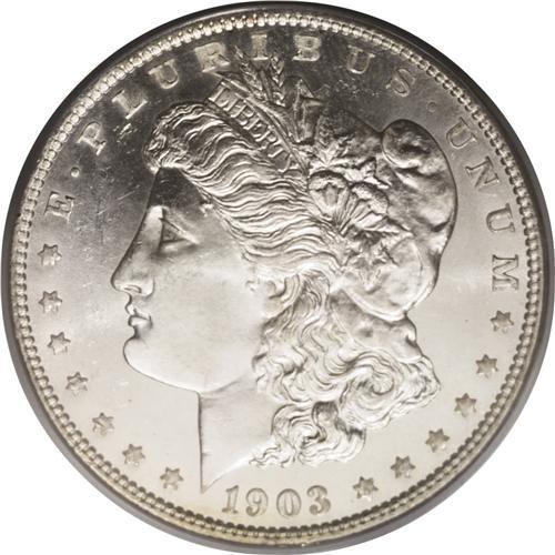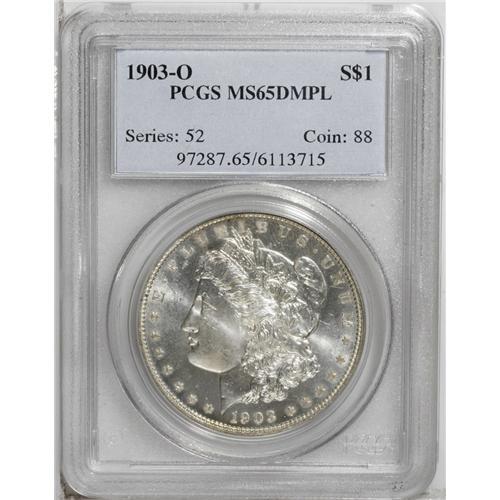 <B>1903-O<img border='0' src='http://www.heritagecoins.com/images/star.gif' width=10 height=10>$1> MS65 Deep Mirror Prooflike PCGS.</B></I> This is an extraordinary Gem with deeply mirrored fields and remarkable contrast. The devices have fully brilliant satin luster. A trace of toning is evident only at the borders on each side. An advantageous opportunity for the advanced collector or specialist. Deep Mirror Prooflike Gems are extremely rare. Population: 10 in 65 DMPL, 3 finer (8/06).