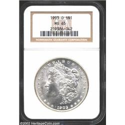 1903-O S$1 MS65 NGC. The 1903-O is an always-popular date that was once regarded as a major rarity in Mint State. The present lot offers a gorgeous Gem with razor sharp striking definition and bright, frosty textured surfaces. There are no abrasions of singular note. Important notice: We expect to be auctioning lots at the rate of 200-250 per hour. Sometimes eBay Premier live bid software cannot keep up with that pace, so we strongly recommend that you place a realistic proxy bid now as insurance to avoid disappointment. Also please note that all Heritage/CAA lots purchased through eBay Premier carry a 20% Buyer's Premium. Please make sure you read the Terms and Conditions.