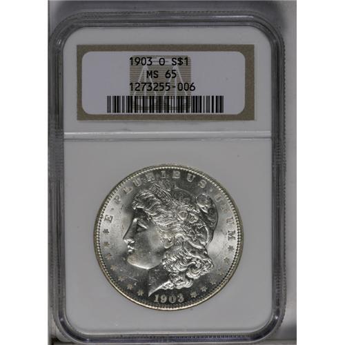 <B>1903-O<img border='0' src='http://www.heritagecoins.com/images/star.gif' width=10 height=10>$1> MS65 NGC.</B></I> This New Orleans Gem has attractive satiny luster and a mostly full strike, with scattered contact marks appropriate for the grade. A light grease stain is seen on the eagle's right (facing) wing.