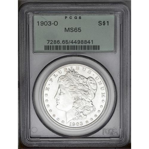 <B>1903-O<img border='0' src='http://www.heritagecoins.com/images/star.gif' width=10 height=10>$1 MS65 PCGS.</B></I> A lustrous, brilliant, and magnificent Gem of this late O-mint issue, famous for its status as a former great rarity. Few collectors had even seen a 1903-O prior to the early 1960s, when bags of Uncirculated examples emerged from Treasury holdings. Certified in a green label holder.