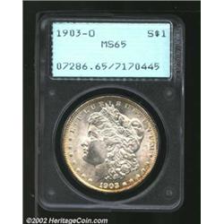 1903-O S$1 MS65 PCGS. Lovely golden-brown peripheral patina. A lustrous Gem that has a sharp strike and virtually pristine fields. The 1903-O is no longer the prized rarity it once was, but it is still a better date. Important notice: We expect to be auctioning lots at the rate of 200-250 per hour. Sometimes eBay Premier live bid software cannot keep up with that pace, so we strongly recommend that you place a realistic proxy bid now as insurance to avoid disappointment. Also please note that all Heritage/CAA lots purchased through eBay Premier carry a 20% Buyer's Premium. Please make sure you read the Terms and Conditions.