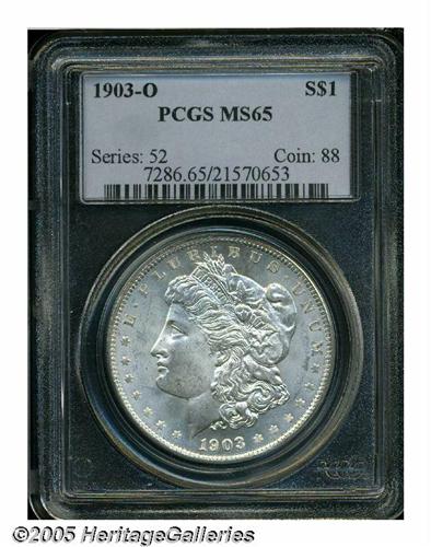 <B>1903-O<S$1> MS65 PCGS.</B></I> This lustrous, virtually untoned O-mint representative is sharply struck, including excellent definition on the hair over Liberty's ear and on the eagle's breast feathers, areas that are often weak on this issue. Examples with a better than average strike, such as this one, are highly desirable. A few minor scuffs on Liberty's cheek and neck are not bothersome.