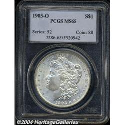 <B>1903-O<S$1> MS65 PCGS.</B></I> Essentially white with only the slightest hint of patina on each side. Solid for a MS65 with minor luster grazes across the lustrous surfaces. <BR><BR><B>Important notice:</B> Heritage usually auctions material at the rate of 200-250 lots per hour. On some occasions eBay Live bid software or the Internet may not be able to keep up with the pace of the auction. We recommend placing a realistic absentee bid now as insurance to avoid disappointment. Occasionally the auctioneer may eliminate or reject an eBay Live bid, and the auctioneer may also reopen a lot after the close of the eBay live bidding (usually because we missed an audience bid), and may reject your bid even if it shows you as the winning bidder. By bidding via eBay Live, you agree that Heritage may award the lot to another bidder at its sole discretion under the circumstances described above or any other reasonable circumstances. Since eBay bids are not shown to us until we open the lot on the floor, we treat those bids just like floor bids. In most cases the floor responds before the eBay bid is presented to us, due to Internet lag time, so for consistency we have made it a policy that floor bids are always considered first over tie eBay live bids. Also please note that all Heritage lots purchased through eBay Live carry a 20% Buyer's Premium. Please make sure you read the Terms and Conditions before you bid.