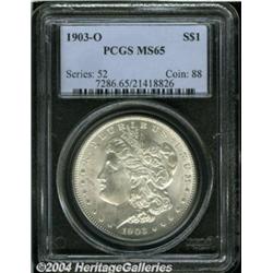 <B>1903-O<S$1> MS65 PCGS.</B></I> Snow-white with frosty surfaces and slight softness noticed above the hair strands above Liberty's ear. Keeping this coin from the Premium Gem level are one mark on Liberty's cheek and several small luster grazes around IN GOD WE TRUST on the reverse. <BR><BR><B>Important notice:</B> Heritage usually auctions material at the rate of 200-250 lots per hour. On some occasions eBay Live bid software or the Internet may not be able to keep up with the pace of the auction. We recommend placing a realistic absentee bid now as insurance to avoid disappointment. Occasionally the auctioneer may eliminate or reject an eBay Live bid, and the auctioneer may also reopen a lot after the close of the eBay live bidding (usually because we missed an audience bid), and may reject your bid even if it shows you as the winning bidder. By bidding via eBay Live, you agree that Heritage may award the lot to another bidder at its sole discretion under the circumstances described above or any other reasonable circumstances. Since eBay bids are not shown to us until we open the lot on the floor, we treat those bids just like floor bids. In most cases the floor responds before the eBay bid is presented to us, due to Internet lag time, so for consistency we have made it a policy that floor bids are always considered first over tie eBay live bids. Also please note that all Heritage lots purchased through eBay Live carry a 20% Buyer's Premium. Please make sure you read the Terms and Conditions before you bid. </span></font></tr></table></td></tr></table>