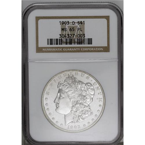<B>1903-O<img border='0' src='http://www.heritagecoins.com/images/star.gif' width=10 height=10>$1> MS65 Prooflike NGC.</B></I> A sharply struck and brilliant Gem that has a nearly immaculate portrait and refreshingly undisturbed fields. In addition to its status as the scarcest twentieth century New Orleans issue, the 1903-O is not often found with prooflike surfaces. Census: 9 in 65, 3 finer (3/06).<BR><I>From The David L. Goodwin Collection.</B></I> <BR><BR><B>Important notice:</B> Heritage usually auctions material at the rate of 200-250 lots per hour. On some occasions eBay Live bid software or the Internet may not be able to keep up with the pace of the auction. We recommend placing a realistic absentee bid now as insurance to avoid disappointment. Occasionally the auctioneer may eliminate or reject an eBay Live bid, and the auctioneer may also reopen a lot after the close of the eBay live bidding (usually because we missed an audience bid), and may reject your bid even if it shows you as the winning bidder. By bidding via eBay Live, you agree that Heritage may award the lot to another bidder at its sole discretion under the circumstances described above or any other reasonable circumstances. Since eBay bids are not shown to us until we open the lot on the floor, we treat those bids just like floor bids. In most cases the floor responds before the eBay bid is presented to us, due to Internet lag time, so for consistency we have made it a policy that floor bids are always considered first over tie eBay live bids. Also please note that all Heritage lots purchased through eBay Live carry a 20% Buyer's Premium. Please make sure you read the Terms and Conditions before you bid. This lot is being auctioned in conjunction with a live floor auction by Heritage Galleries & Auctioneers. All final auction and invoice information will be supplied by Heritage Galleries & Auctioneers, and all other information should be considered preliminary. Lot:3780 <BR><BR><B>Winning Notification and Billing:</B> After the FINAL session in this auction is complete, Heritage will send e-mail and snail mail invoices. This process normally takes several days. All final auction and invoice information will be supplied by Heritage Galleries & Auctioneers, and all other information should be considered preliminary. <BR><BR>This auction will be conducted on a live auction floor and over the Internet through eBay Live. If you choose to place an absentee bid, please take a moment to <font color='#0000ff'><u><a href='http://pages.ebay.com/liveauctions/help/before/laabsentee.html'>learn how eBay Live absentee bidding works</a></u></font><font color='#000000'>
