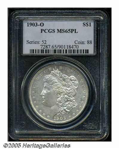 <B>1903-O<S$1> MS65 Prooflike PCGS.</B></I> A light-colored coating of milky patina covers both sides, failing to conceal the violent, flashy reflectivity in the fields, under adequate illumination. A couple of small milling marks, on each side of the piece, fail to hinder the Gem grade assessment, accompanied by the significantly scarcer Prooflike designation. A well struck, highly attractive representative of this New Orleans issue, which is rarely see with a Prooflike finish. Population: 16 in 65 Prooflike, 2 finer (4/05).