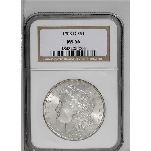 <B>1903-O<img border='0' src='http://www.heritagecoins.com/images/star.gif' width=10 height=10>$1> MS66 NGC.</B></I> The Treasury releases of the early 1960s dispelled this issue's rarity. Even so, this nicely struck piece with attractive luster and untoned surfaces is still a great addition to almost any collection.