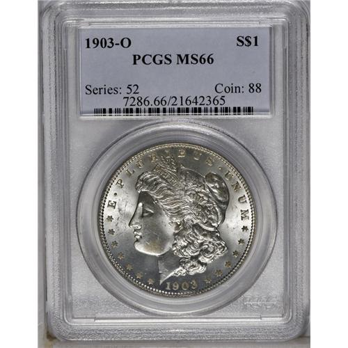 <B>1903-O<img border='0' src='http://www.heritagecoins.com/images/star.gif' width=10 height=10>$1> MS66 PCGS.</B></I> Mostly brilliant and untoned with mustard-yellow highlights on the chin, date, and lower stars. Slight central softness, typical for the issue, is present on both sides.<BR><I>From The Chicago-Ark Collection.</B></I>