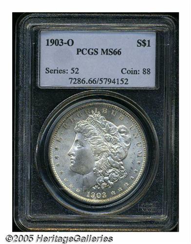 <B>1903-O<S$1> MS66 PCGS.</B></I> The lustrous surfaces are covered in faint orange patina with slightly mottled teal, tan, and violet on the upper obverse periphery and around the reverse border. Some scattered small luster grazes blend effortlessly in to the surfaces making them very undistracting, and the design elements are well impressed throughout.