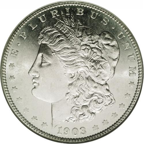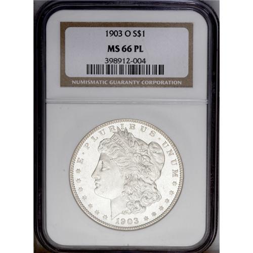 <B>1903-O<img border='0' src='http://www.heritagecoins.com/images/star.gif' width=10 height=10>$1 MS66 Prooflike NGC.</B></I> A sharply struck and brilliant Premium Gem that has a nearly immaculate portrait and refreshingly minimally undisturbed fields. In addition to its status as the scarcest twentieth century New Orleans issue, the 1903-O is not often found with prooflike surfaces, as attested to by the population figures. NGC and PCGS combined have seen only four coins in this grade level that exhibit a prooflike finish, and only one piece grading finer (1/06).
