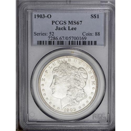 <B>1903-O<img border='0' src='http://www.heritagecoins.com/images/star.gif' width=10 height=10>$1> MS67 PCGS.</B></I> Ex: Jack Lee. Lustrous and lightly toned with a bold strike and remarkably smooth surfaces. Once regarded as a formidable rarity, the status of the 1903-O changed when bags of Mint State pieces exited the Treasury hoard during the early 1960s. The 1903-O remains the toughest among the 20th century New Orleans issues, and although typical Uncirculated pieces are common, surprisingly few exist at the MS67 level. The combined forces of PCGS and NGC have certified 73 pieces as MS67 with none finer.<BR><I>From The Michael Casper Collection, Part Three.</B></I>