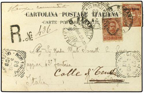 1903 Real photograph postcard sent registered bearing 1898 2 c. red brown and 10 c. claret overprinted tied by Saganetti cds´s. Readdressed on arrival in Italy. A scarce usage. Scott 13,15.