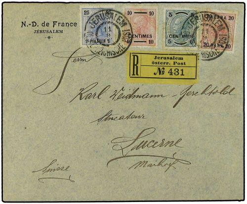 1903 Registered cover to Lucerne franked at 1½ piastre rate with four adhesives (5 c., 10 c., 20 para and 1 pi) all tied by Jerusalem Austrian PO cds´s (Sept 11) with yellow registered label below. A fine and scarce franking with Lucerne arrival on reverse.