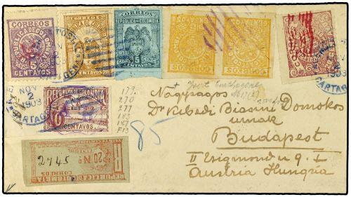 1903 Registered envelope to Budapest, Hungary, with multi-franking (7 vals) tied by Cartagena date stamp. On reverse, New York transit cds.