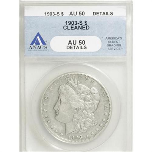 <B>1903-S $1 --Cleaned--ANACS. AU50 Details.</B></I> NGC Census: (85/366). PCGS Population (56/675). Mintage: 1,241,000. Numismedia Wsl. Price for NGC/PCGS coin in AU50: $1,650. (#7288)<BR><BR><B>Coin Engraver:</B> George T. Morgan<BR><BR><b>Shipping:</b> Coins & Currency (<a target="_blank" href="http://www.heritageauctions.com/common/shipping.php">view shipping information</a>)