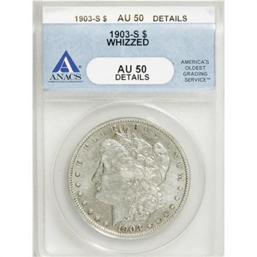 <B>1903-S $1 --Whizzed--ANACS. AU50 Details.</B></I> NGC Census: (85/362). PCGS Population (56/675). Mintage: 1,241,000. Numismedia Wsl. Price for NGC/PCGS coin in AU50: $1,625. (#7288)<BR><BR><B>Coin Engraver:</B> George T. Morgan<BR><BR><b>Shipping:</b> Coins & Currency (<a target="_blank" href="http://www.heritageauctions.com/common/shipping.php">view shipping information</a>)