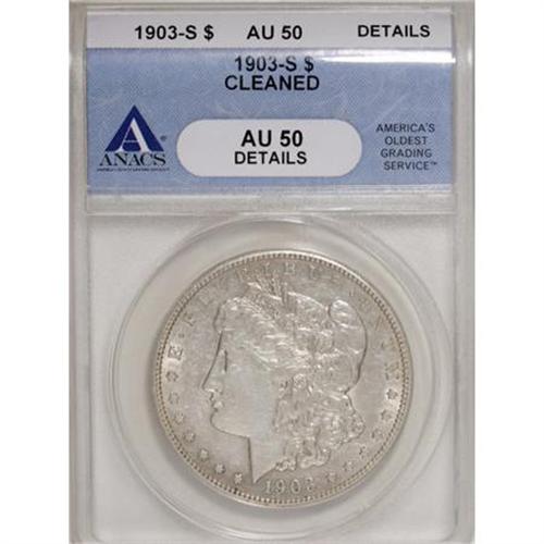 <B>1903-S $1 --Cleaned--ANACS. AU50 Details.</B></I> NGC Census: (86/367). PCGS Population (56/682). Mintage: 1,241,000. Numismedia Wsl. Price for NGC/PCGS coin in AU50: $1,650. (#7288)<BR><BR><B>Coin Engraver:</B> George T. Morgan<BR><BR><b>Shipping:</b> Coins & Currency (<a target="_blank" href="http://www.heritageauctions.com/common/shipping.php">view shipping information</a>)