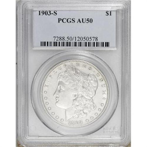 <B>1903-S $1 AU50 PCGS.</B></I> An untoned example of this scarce San Francisco emission. The centers display the expected light wear, but luster shimmers from design crevices. No marks merit mention aside from a tiny reverse rim nick at 10:30.<BR><BR><B>Coin Engraver:</B> George T. Morgan<BR><BR><b>Shipping:</b> Coins & Currency (<a target="_blank" href="http://www.heritageauctions.com/common/shipping.php">view shipping information</a>)