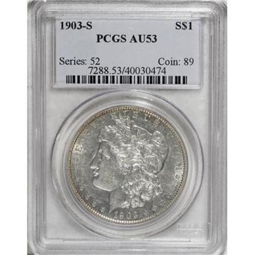 <B>1903-S $1 AU53 PCGS.</B></I> A still-lustrous steel-gray representative of this challenging 20th century S-mint issue, well struck with wear concentrated on the highpoints, which display cloud-gray patina. Scattered wispy abrasions are noted on each side.<BR><BR><B>Coin Engraver:</B> George T. Morgan<BR><BR><b>Shipping:</b> Coins & Currency (<a target="_blank" href="http://www.heritageauctions.com/common/shipping.php">view shipping information</a>\)