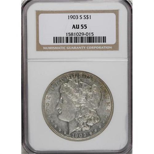 <B>1903-S $1 AU55 NGC.</B></I> A softly struck, lightly circulated representative of this challenging later S-mint issue, delicately gold-toned with strong remaining luster at the obverse margins and the reverse. Lightly abraded with small areas of distinct wear at the highpoints.<BR><BR><B>Coin Engraver:</B> George T. Morgan<BR><BR><b>Shipping:</b> Coins & Currency (<a target="_blank" href="http://www.heritageauctions.com/common/shipping.php">view shipping information</a>)
