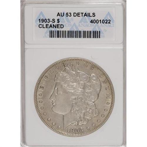 <B>1903-S $1 --Cleaned--ANACS. AU53 Details.</B></I> Cloudy mustard-silver patina drapes each side of this briefly circulated 20th century S-mint Morgan dollar. Typically soft at the centers with light wear and moderately hairlined fields.<BR><BR><B>Coin Engraver:</B> George T. Morgan<BR><BR><b>Shipping:</b> Coins & Currency (<a target="_blank" href="http://www.heritageauctions.com/common/shipping.php">view shipping information</a>)