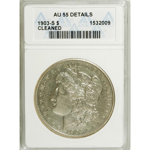 <B>1903-S $1 --Cleaned--ANACS. AU55 Details.</B></I> NGC Census: (41/253). PCGS Population (28/594). Mintage: 1,241,000. Numismedia Wsl. Price for NGC/PCGS coin in AU55: $1,250. (#7288)<BR><BR><b>Shipping:</b> Coins & Currency (<a target="_blank" href="http://www.heritageauctions.com/common/shipping.php">view shipping information</a>)