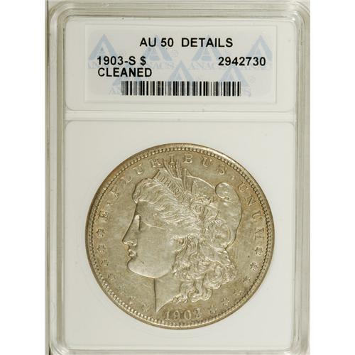 <B>1903-S $1 --Cleaned--ANACS. AU50 Details.</B></I> NGC Census: (166/702). PCGS Population (50/664). Mintage: 1,241,000. Numismedia Wsl. Price for NGC/PCGS coin in AU50: $1,000. (#7288)<BR><BR><b>Shipping:</b> Coins & Currency (<a target="_blank" href="http://www.heritageauctions.com/common/shipping.php">view shipping information</a>)