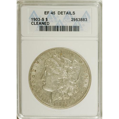 <B>1903-S $1 --Cleaned--ANACS. XF45 Details.</B></I> NGC Census: (212/422). PCGS Population (157/706). Mintage: 1,241,000. Numismedia Wsl. Price: $494. (#7288)<BR><BR><b>Shipping:</b> Coins & Currency (<a target="_blank" href="http://www.heritageauctions.com/common/shipping.php">view shipping information</a>)