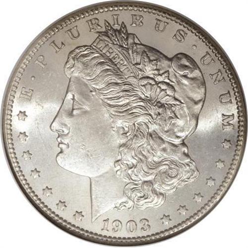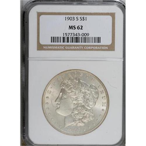 <B>1903-S $1 MS62 NGC.</B></I> The 1903-S Morgan dollar is most often seen well worn, and Mint State survivors are very scarce. This piece has creamy-white color and somewhat flashy mint luster that becomes semi-prooflike on the reverse. Well struck overall, with just a bit of central softness detected above Liberty's ear and on the eagle's breast. There is a moderate abrasion in the left obverse field, and a handful of minor marks are noted on the reverse. <BR><BR><B>Coin Engraver:</B> George T. Morgan<BR><BR><b>Shipping:</b> Coins & Currency (<a target="_blank" href="http://www.heritageauctions.com/common/shipping.php">view shipping information</a>)