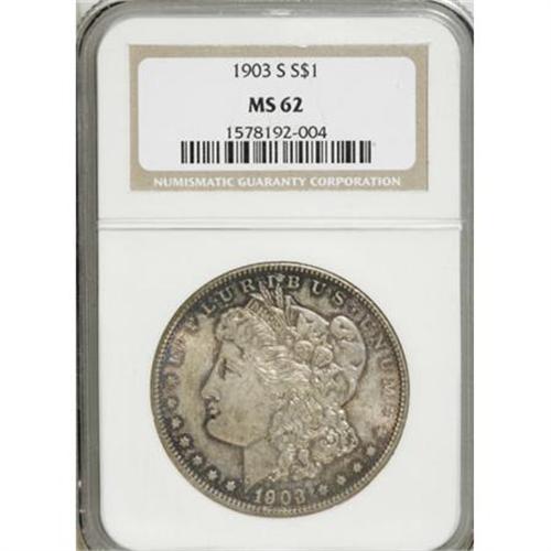 <B>1903-S $1 MS62 NGC.</B></I> The fields are toned in complex deep shades of chocolate and bronze, especially pronounced at the rims. The devices are colored a light shade of rose-gold and the overall look is attractive. The surfaces display numerous scuffs and light scratches, entirely consistent with the grade. The 1903-S has a limited mintage for the series of just over 1.2 million pieces and a relatively small percentage escaped both the ravages of Western commerce and the mass meltings of the Pittman Act.<BR><BR><B>Coin Engraver:</B> George T. Morgan<BR><BR><b>Shipping:</b> Coins & Currency (<a target="_blank" href="http://www.heritageauctions.com/common/shipping.php">view shipping information</a>)