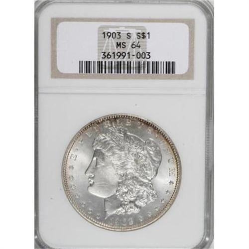 <B>1903-S $1 MS64 NGC.</B></I> Strong definition and vibrant luster are the chief elements of this lovely near-Gem's excellent eye appeal. A touch of reddish-orange patina graces the rims, but the minimally marked surfaces are otherwise untoned. The 1903-S ranks among the most challenging Morgan dollars of the 20th century, particularly in Mint State grades. NGC has graded only 49 finer representatives (8/07).<BR><BR><B>Coin Engraver:</B> George T. Morgan<BR><BR><b>Shipping:</b> Coins & Currency (<a target="_blank" href="http://www.heritageauctions.com/common/shipping.php">view shipping information</a>)