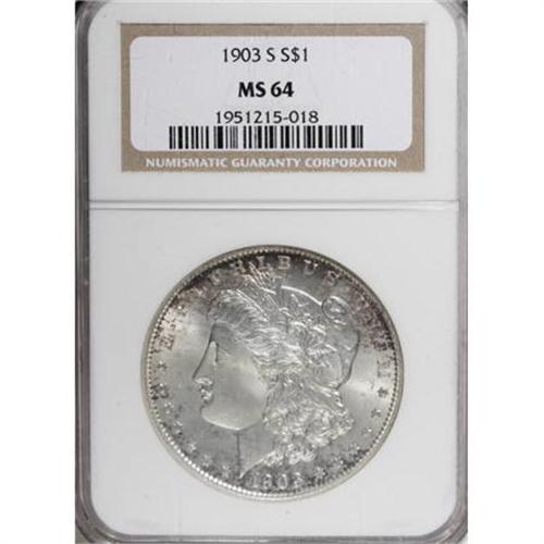 <B>1903-S $1 MS64 NGC.</B></I> Well-defined overall for this sublimely challenging S-mint issue, though a hint of softness is noted at the centers. Both sides offer powerful luster beneath hazy patina, largely silver-gray with elements of violet and sage at the margins. Highly elusive any finer, with just 44 such pieces graded by NGC (2/08).<BR><I>From The Silver Spur Collection of Morgan Dollars.</B></I><BR><BR><B>Coin Engraver:</B> George T. Morgan<BR><BR><b>Shipping:</b> Coins & Currency (<a target="_blank" href="http://www.heritageauctions.com/common/shipping.php">view shipping information</a>)