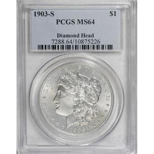 <B>1903-S $1 MS64 PCGS.</B></I> Although produced in significant numbers (1.2 million pieces), the 1903-S is an elusive coin in all grades that is among the rarer 20th century Morgan dollars at the present level of preservation, behind only the 1901. The smooth, nearly blemish-free surfaces are just shy of a full Gem grade. The features are nicely frosted with a swirling cartwheel sheen beneath smoky-gray and apricot patina.<BR><I>From the Diamond Head Registry Set of Prooflike Dollars.</B></I><BR><BR><B>Coin Engraver:</B> George T. Morgan<BR><BR><b>Shipping:</b> Coins & Currency (<a target="_blank" href="http://www.heritageauctions.com/common/shipping.php">view shipping information</a>\)