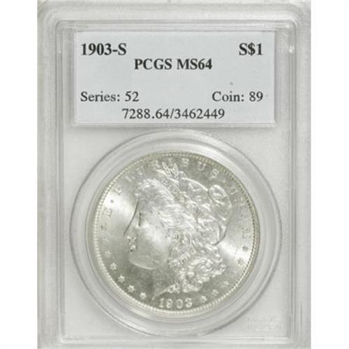 <B>1903-S $1 MS64 PCGS.</B></I> VAM-4. One of the "Two Olive Reverse" varieties, caused by the use of two different (although similar) hubs to create the reverse die. A brilliant and intricately struck near-Gem that has an impressively unabraded appearance. All S-mint dollars from this decade are scarce, but the 1903-S is the most elusive.<BR><BR><B>Coin Engraver:</B> George T. Morgan<BR><BR><b>Shipping:</b> Coins & Currency (<a target="_blank" href="http://www.heritageauctions.com/common/shipping.php">view shipping information</a>)