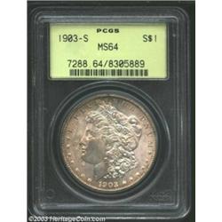 <TR><TD width="100%"><TABLE cellSpacing=1 cellPadding=3 width="100%" border=0><TBODY><TR><TD width="100%" bgColor=#79735c><FONT face=arial color=#ffffff size=3><B>Description</B> </FONT></TD></TR><TR><TD width="100%" bgColor=#ffffff><FONT face=arial size=2><B>1903-S $1 MS64 PCGS.</B></I> Extremely well struck with pale lilac patina intensifying to crescents of orange toning on the left sides of both obverse and reverse. A cluster of marks just above and below Liberty's eye rule out a more valuable Gem rating, but the originality of this difficult late date S-mint is far and away its best feature. </FONT></TD></TR></TBODY></TABLE></TD></TR></TBODY></TABLE><BR><A name=PricesRealized></A><TABLE cellSpacing=0 cellPadding=0 width="100%" bgColor=#000000 border=0><TBODY><TR><TD width="100%"><TABLE cellSpacing=1 cellPadding=3 width="100%" border=0><TBODY><TR><TD width="100%" bgColor=#79735c><A name=PR><FONT face=arial color=#ffffff size=3><B>Previous Prices from Heritage Auctions</B> </FONT></A></TD></TR><TR><TD bgColor=#f6f6ed><TABLE cellSpacing=0 cellPadding=0 width="100%" border=1><TBODY><TR><TD align=middle width="33%"><B>Date</B></TD><TD align=middle width="33%"><B>Service</B></TD><TD align=middle width="33%"><B>Price</B></TD></TR><TR bgColor=whitesmoke><TD width="33%"><B>09/28/2002</B></TD><TD width="33%">PCGS</TD><TD width="33%">$3,910.00</TD></TR><TR bgColor=whitesmoke><TD width="33%"><B>01/12/2002</B></TD><TD width="33%">PCGS</TD><TD width="33%">$3,737.50</TD></TR><TR bgColor=whitesmoke><TD width="33%"><B>08/08/2001</B></TD><TD width="33%">PCGS</TD><TD width="33%">$4,140.00</TD></TR><TR bgColor=whitesmoke><TD width="33%"><B>01/02/2001</B></TD><TD width="33%">PCGS</TD><TD width="33%">$3,700.00</TD></TR><TR bgColor=whitesmoke><TD width="33%"><B>08/19/1995</B></TD><TD width="33%">PCGS</TD><TD width="33%">$3,850.00</TD></TR><TR bgColor=whitesmoke><TD width="33%"><B>11/17/1995</B></TD><TD width="33%">PCGS</TD><TD width="33%">$3,905.00</TD></TR><TR bgColor=whitesmoke><TD width="33%"><B>03/04/1995</B></TD><TD width="33%">PCGS</TD><TD width="33%">$4,015.00</TD></TR><TR bgColor=whitesmoke><TD width="33%"><B>02/01/1999</B></TD><TD width="33%">PCGS</TD><TD width="33%">$3,910.00</TD></TR><TR bgColor=whitesmoke><TD width="33%"><B>10/01/1998</B></TD><TD width="33%">PCGS</TD><TD width="33%">$4,180.00</TD></TR><TR bgColor=whitesmoke><TD width="33%"><B>11/01/1999</B></TD><TD width="33%">PCGS</TD><TD width="33%">$3,680.00</TD></TR><TR bgColor=whitesmoke><TD width="33%"><B>06/01/2000</B></TD><TD width="33%">PCGS</TD><TD width="33%">$3,738.00</TD></TR><TR bgColor=whitesmoke><TD width="33%"><B>03/01/1999</B></TD><TD width="33%">PCGS</TD><TD width="33%">$3,910.00</TD></TR><TR bgColor=whitesmoke><TD width="33%"><B>07/30/2002</B></TD><TD width="33%">NGC</TD><TD width="33%">$4,025.00</TD></TR><TR bgColor=whitesmoke><TD width="33%"><B>06/01/1996</B></TD><TD width="33%">NGC</TD><TD width="33%">$3,520.00</TD></TR><TR bgColor=whitesmoke><TD width="33%"><B>09/24/1999</B></TD><TD width="33%">NGC</TD><TD width="33%">$3,680.00</TD></TR><TR bgColor=whitesmoke><TD width="33%"><B>03/01/1995</B></TD><TD width="33%">NGC</TD><TD width="33%">$3,960.00</TD></TR></TBODY></TABLE></TD></TR><TR><TD bgColor=#ffffff><FONT face=arial size=1 ?>PLEASE NOTE: All prices realized reflect the final hammer price PLUS the buyer's premium in auctions that charge a buyer's premium. Each item has a notation at the top of the listing indicating whether that lot included a buyer's premium. Example: A item that sells with a final hammer price of $100 and a 20% buyer's premium will display with a price realized of $120. All information listed is intended to be as accurate as possible, but errors are possible. Please use this guide carefully and inform us of any inaccuracies. </FONT></TD></TR></TBODY></TABLE></TD></TR></TBODY></TABLE><BR><TABLE cellSpacing=0 cellPadding=0 width="100%" bgColor=#000000 border=0><TBODY><TR><TD width="100%"><TABLE cellSpacing=1 cellPadding=3 width="100%" border=0><TBODY><TR><TD width="100%" bgColor=#79735c colSpan=6><FONT face=arial color=#ffffff size=3><B>Price Guide*</B> </FONT></TD></TR><TR bgColor=#f6f6ed><TD align=middle><B>Grade</B> </TD><TD align=middle><B>Coin World<BR>(Trends)</B> </TD><TD align=middle><B>Numismedia<BR>Retail</B> </TD><TD align=middle><B>Numismedia<BR>Wholesale</B> </TD><TD align=middle><B>Coin<BR>Universe</B> </TD><TD align=middle><B>Heritage<BR>Value Index</B> </TD></TR><TR bgColor=#ffffff><TD align=middle>63</TD><TD align=right>$4,250.00</TD><TD align=right>---</TD><TD align=right>$3,125.00</TD><TD align=right>$4,650.00</TD><TD align=right>$2,988.75</TD></TR><TR style="FONT-WEIGHT: bold" bgColor=#cccfdd><TD align=middle>64</TD><TD align=right>$5,000.00</TD><TD align=right>---</TD><TD align=right>$3,910.00</TD><TD align=right>$5,600.00</TD><TD align=right>$3,673.50</TD></TR><TR bgColor=#ffffff><TD align=middle>65</TD><TD align=right>$7,150.00</TD><TD align=right>---</TD><TD align=right>$5,875.00</TD><TD align=right>$7,500.00</TD><TD align=right>$4,981.25</TD></TR><TR bgColor=#ffffff><TD colSpan=6><FONT size=1>*All information listed is intended to be as accurate as possible, but errors are possible. No item may be returned or refused based on this information which is provided as a service to our customers. You should contact each pricing source directly to determine the accuracy of this information. </FONT></TD></TR></TBODY></TABLE></TD></TR></TBODY></TABLE><BR><TABLE cellSpacing=0 cellPadding=0 width="100%" bgColor=#000000 border=0><TBODY><TR><TD width="100%"><TABLE cellSpacing=1 cellPadding=3 width="100%" border=0><TBODY><TR><TD width="100%" bgColor=#79735c><FONT face=arial color=#ffffff size=3><B>Population Guide</B> </FONT></TD></TR><TR bgColor=#ffffff><TD align=middle><!-- Begin Output of Population Grid--><TABLE cellSpacing=0 cellPadding=0 width="100%" border=0><TBODY><TR><TD vAlign=center><TABLE cellSpacing=0 width="100%" border=1 cellsadding="3"><TBODY><TR><TD vAlign=center><TABLE ce