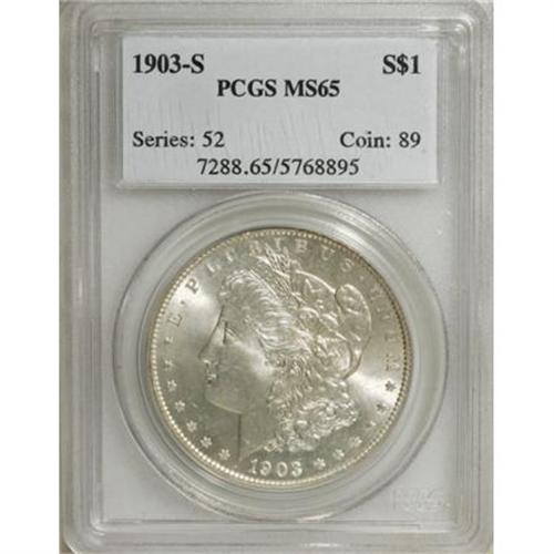 <B>1903-S $1 MS65 PCGS.</B></I> The silvery surfaces are largely color-free, and while there is good cartwheel luster present, there is, as usual for the issue, little contrast between the fields and devices. Neither side shows much evidence of contact, and the strike is decent, if a trifle soft in the centers. Seldom seen finer.<BR><I>From The Jimmy G. PCGS Registry Collection of Morgan Dollars with Varieties.</B></I><BR><BR><B>Coin Engraver:</B> George T. Morgan<BR><BR><b>Shipping:</b> Coins & Currency (<a target="_blank" href="http://www.heritageauctions.com/common/shipping.php">view shipping information</a>)