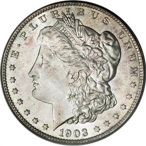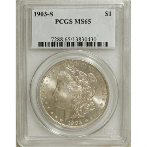 <B>1903-S $1 MS65 PCGS.</B></I> Dappled sky-blue, apricot, and caramel-gold endow this nicely lustrous and attentively struck Gem. The fields are uncommonly void of contact, as is the eagle. Even Liberty's face and neck have only inconsequential marks. The 1903-S is the post-1901 key, and is highly desirable with such outstanding preservation.<BR><BR><B>Coin Engraver:</B> George T. Morgan<BR><BR><b>Shipping:</b> Coins & Currency (<a target="_blank" href="http://www.heritageauctions.com/common/shipping.php">view shipping information</a>)