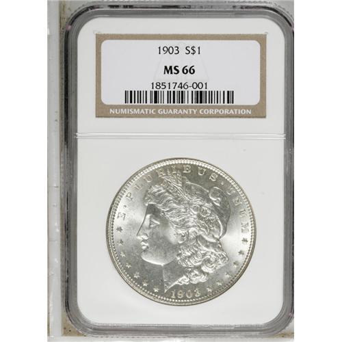 <B>1903<img border='0' src='http://www.heritagecoins.com/images/star.gif' width=10 height=10>$1> MS66 NGC.</B></I> A lustrous and luscious example of this generally well produced issue, one that usually shows a satiny surface, as here. This untoned Premium Gem shows a crisp strike on the hair above the ear, with only a few light ticks on the eagle, as expected for the grade. Liberty's cheek is exceptionally clean.
