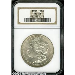 <B>1903<S$1> MS66 NGC.</B></I> Ex: Keith Ramsey Collection. Well struck with a light coating of dappled milky toning over both sides, and a few insignificant surface marks. <BR><BR><B>Important notice:</B> Heritage usually auctions material at the rate of 200-250 lots per hour. On some occasions eBay Live bid software or the Internet may not be able to keep up with the pace of the auction. We recommend placing a realistic absentee bid now as insurance to avoid disappointment. Occasionally the auctioneer may eliminate or reject an eBay Live bid, and the auctioneer may also reopen a lot after the close of the eBay live bidding (usually because we missed an audience bid), and may reject your bid even if it shows you as the winning bidder. By bidding via eBay Live, you agree that Heritage may award the lot to another bidder at its sole discretion under the circumstances described above or any other reasonable circumstances. Since eBay bids are not shown to us until we open the lot on the floor, we treat those bids just like floor bids. In most cases the floor responds before the eBay bid is presented to us, due to Internet lag time, so for consistency we have made it a policy that floor bids are always considered first over tie eBay live bids. Also please note that all Heritage lots purchased through eBay Live carry a 20% Buyer's Premium. Please make sure you read the Terms and Conditions before you bid. </span></font></tr></table></td></tr></table>