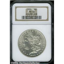 <B>1903<S$1> MS66 NGC.</B></I> Snow-white with several dwarf abrasions, this Premium Gem is highly effulgent with crisply struck devices. Would make for a great addition to a high end type set. <BR><BR><B>Important notice:</B> Heritage usually auctions material at the rate of 200-250 lots per hour. On some occasions eBay Live bid software or the Internet may not be able to keep up with the pace of the auction. We recommend placing a realistic absentee bid now as insurance to avoid disappointment. Occasionally the auctioneer may eliminate or reject an eBay Live bid, and the auctioneer may also reopen a lot after the close of the eBay live bidding (usually because we missed an audience bid), and may reject your bid even if it shows you as the winning bidder. By bidding via eBay Live, you agree that Heritage may award the lot to another bidder at its sole discretion under the circumstances described above or any other reasonable circumstances. Since eBay bids are not shown to us until we open the lot on the floor, we treat those bids just like floor bids. In most cases the floor responds before the eBay bid is presented to us, due to Internet lag time, so for consistency we have made it a policy that floor bids are always considered first over tie eBay live bids. Also please note that all Heritage lots purchased through eBay Live carry a 20% Buyer's Premium. Please make sure you read the Terms and Conditions before you bid. </span></font></tr></table></td></tr></table>