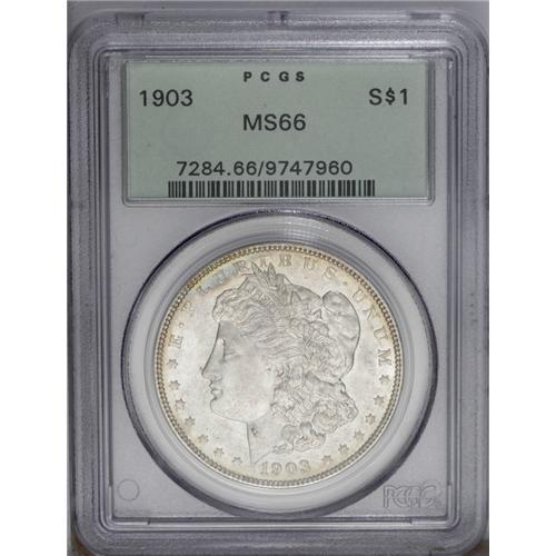 <B>1903<img border='0' src='http://www.heritagecoins.com/images/star.gif' width=10 height=10>$1 MS66 PCGS.</B></I> Light gold toning is interrupted only by a glimpse of sky-blue color near 11 o'clock on the obverse. Pinpoint sharp and magnificently preserved, this older holder premium Gem is a worthy selection for the advanced Morgan Dollar collection.