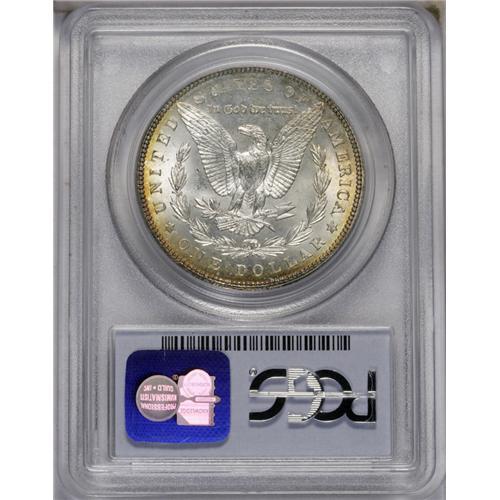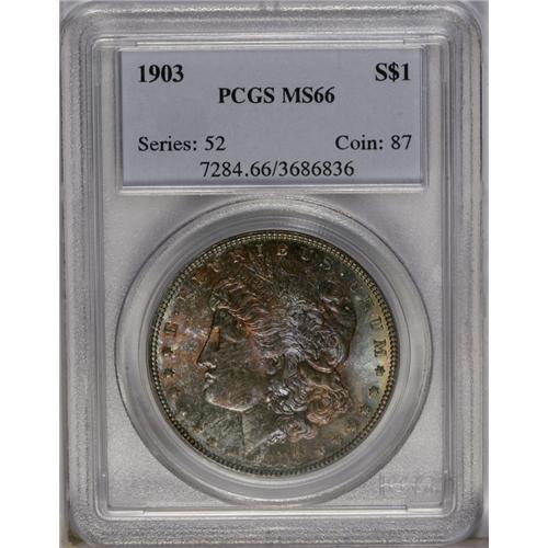 <B>1903<img border='0' src='http://www.heritagecoins.com/images/star.gif' width=10 height=10>$1> MS66 PCGS.</B></I> Well struck with slightly subdued luster. Rainbow toning on the obverse gives way to peripheral golden toning around an untoned center on the reverse. Minimal marks are as one would expect for the grade.