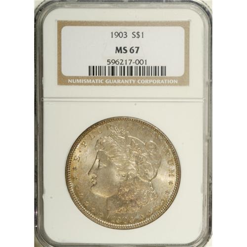 <B>1903 S$1 MS67 NGC.</B></I> Delicate rose-orange patina graces the highly lustrous surfaces of this suitably struck Superb Gem. Hardly any marks are present. Census: 74 in 67, 1 finer (1/07).<BR><BR><b>Shipping:</b> Coins & Currency (<a target="_blank" href="http://www.heritageauctions.com/common/shipping.php">view shipping information</a>)