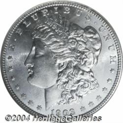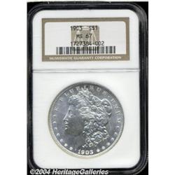 <B>1903<S$1> MS67 NGC.</B></I> Superb in every respect, exhibiting vibrant luster, pinpoint definition, and a white, monochromatic finish on both sides. Exquisitely preserved and nearly mark-free. Population: 39 in 67, 1 finer (7/04). <BR><BR><B>Important notice:</B> Heritage usually auctions material at the rate of 200-250 lots per hour. On some occasions eBay Live bid software or the Internet may not be able to keep up with the pace of the auction. We recommend placing a realistic absentee bid now as insurance to avoid disappointment. Occasionally the auctioneer may eliminate or reject an eBay Live bid, and the auctioneer may also reopen a lot after the close of the eBay live bidding (usually because we missed an audience bid), and may reject your bid even if it shows you as the winning bidder. By bidding via eBay Live, you agree that Heritage may award the lot to another bidder at its sole discretion under the circumstances described above or any other reasonable circumstances. Since eBay bids are not shown to us until we open the lot on the floor, we treat those bids just like floor bids. In most cases the floor responds before the eBay bid is presented to us, due to Internet lag time, so for consistency we have made it a policy that floor bids are always considered first over tie eBay live bids. Also please note that all Heritage lots purchased through eBay Live carry a 20% Buyer's Premium. Please make sure you read the Terms and Conditions before you bid. </span></font></tr></table></td></tr></table>