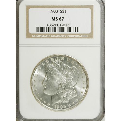 <B>1903 S$1 MS67 NGC.</B></I> Sharply struck and brilliant, with bright satin luster and minimal surface blemishes. A lovely Superb Gem dollar. Philadelphia silver dollars from the first decade of the 20th century are usually scarcer than their New Orleans counterparts, but the 1903 is an exception, as it is moderately more available than the 1903-O. Census: 75 in 67, 1 finer (3/07).<BR><BR><b>Shipping:</b> Coins & Currency (<a target="_blank" href="http://www.heritageauctions.com/common/shipping.php">view shipping information</a>) <BR><BR><B>Importa