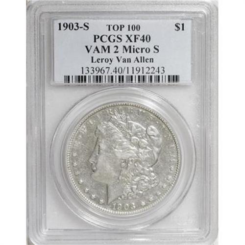 <B>1903-S $1 Micro S XF40 PCGS.</B></I> Ex: Leroy Van Allen. VAM-2, Micro S. A Top 100 Variety. The mintmark, unique to one reverse die of 1903, appears to have been intended for Barber quarters rather than Morgan dollars. This still-lustrous piece has light wear consistent with the grade, but no mentionable impairments.<BR><I>From The Leroy Van Allen Collection.</B></I><BR><BR><b>Shipping:</b> Coins & Currency (<a target="_blank" href="http://www.heritageauctions.com/common/shipping.php">view shipping information</a>)