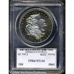 <B>1903<S$1> PR63 PCGS.</B></I> Beautiful cobalt-blue, violet, and burnt-orange toning leaves a window of brilliance on the obverse and a curved swath across the reverse. Much flashier than the typical PR63 specimen. <BR><BR><B>Important notice:</B> Heritage usually auctions material at the rate of 200-250 lots per hour. On some occasions eBay Live bid software or the Internet may not be able to keep up with the pace of the auction. We recommend placing a realistic absentee bid now as insurance to avoid disappointment. Occasionally the auctioneer may eliminate or reject an eBay Live bid, and the auctioneer may also reopen a lot after the close of the eBay live bidding (usually because we missed an audience bid), and may reject your bid even if it shows you as the winning bidder. By bidding via eBay Live, you agree that Heritage may award the lot to another bidder at its sole discretion under the circumstances described above or any other reasonable circumstances. Since eBay bids are not shown to us until we open the lot on the floor, we treat those bids just like floor bids. In most cases the floor responds before the eBay bid is presented to us, due to Internet lag time, so for consistency we have made it a policy that floor bids are always considered first over tie eBay live bids. Also please note that all Heritage lots purchased through eBay Live carry a 20% Buyer's Premium. Please make sure you read the Terms and Conditions before you bid.