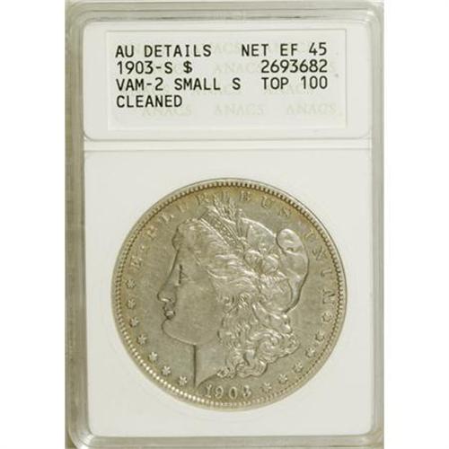 <B>1903-S $1 Small S--Cleaned--ANACS. AU Details, Net XF45. </B></I>VAM-2. A Top 100 Variety.<B> </B></I>(#7306)<BR><BR><b>Shipping:</b> Coins & Currency (<a target="_blank" href="http://www.heritageauctions.com/common/shipping.php">view shipping information</a>)