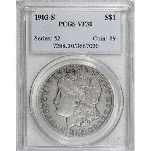 <B>1903-S $1 VF30 PCGS.</B></I> . PCGS Population (69/1154). NGC Census: (73/849). Mintage: 1,241,000. Numismedia Wsl. Price for NGC/PCGS coin in VF30: $238. (#7288)<BR><BR><B>Coin Engraver:</B> George T. Morgan<BR><BR><b>Shipping:</b> Coins & Currency (<a target="_blank" href="http://www.heritageauctions.com/common/shipping.php">view shipping information</a>)